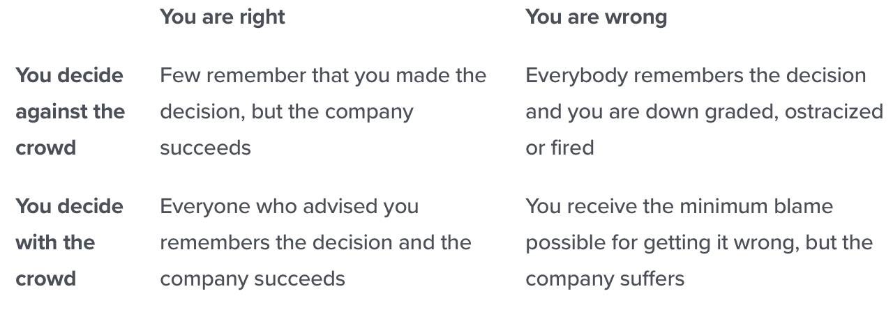 On the surface, it appears that if the decision is a close call, it’s much safer to go with the crowd. In reality, if you fall into this trap, the crowd will influence your thinking and make a 70/30 decision seem like a 51/49 decision. This is why courage is critical.